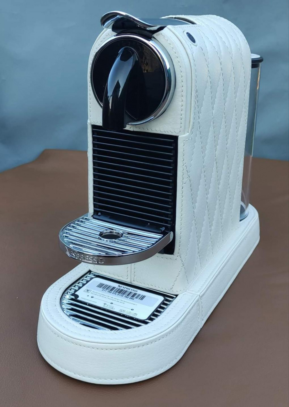 Aparate de cafea pe baza capsule - nespresso. A fost personalizat manual de atelierul Tudor Zavtonii și anume acoperit total cu piele naturală.